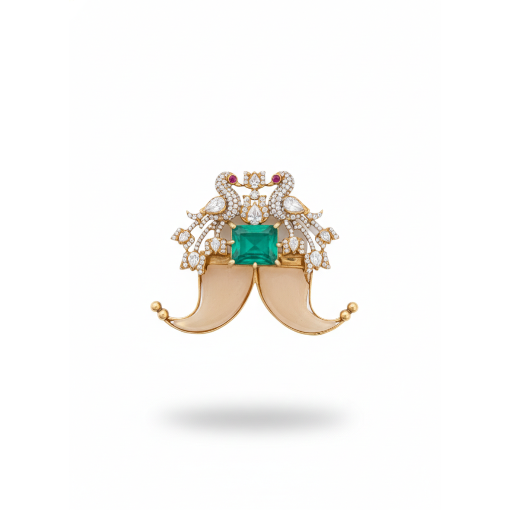 A richly detailed Puligoru showcasing peacock motifs with a square emerald centerpiece, accented by red kundans, Swarovski, and moissanite stones. Gold ball detailing enhances its traditional appeal.