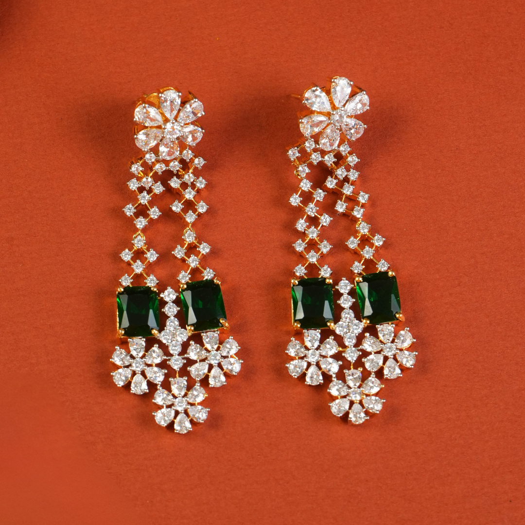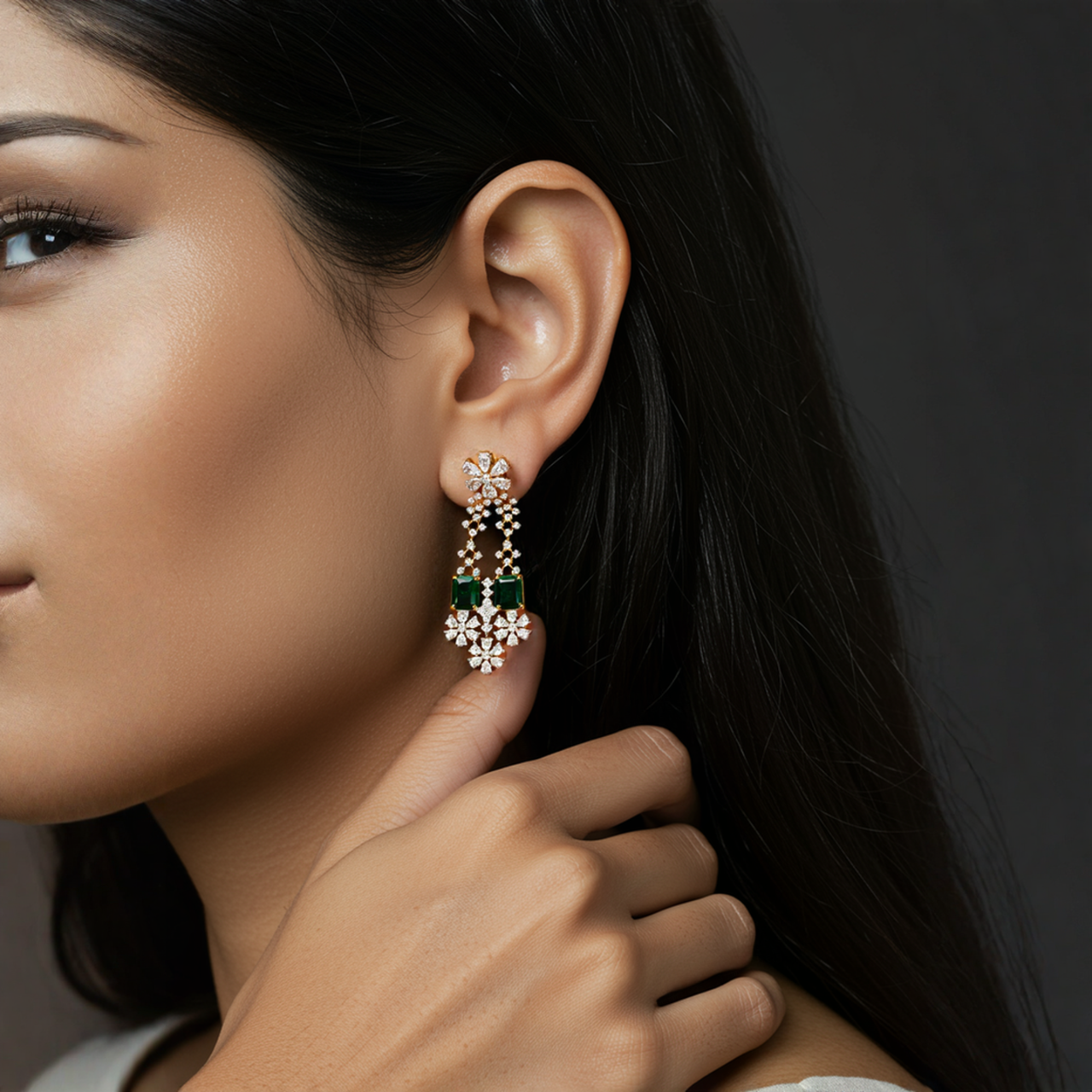 These delicate earrings combine floral motifs with dazzling Swarovski stones and a fresh emerald twist. Lightweight yet impactful, they’re designed to bring effortless elegance. Ideal for pastel sarees, evening gowns, and festive brunches.