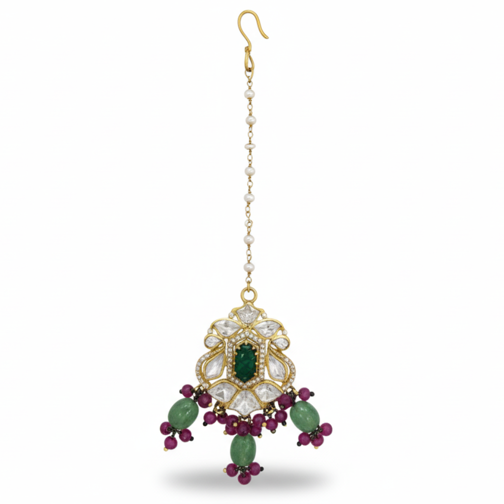 A simple chain maangtikka with a bold, fancy pendant featuring Swarovski and moissanite stones with green and pink hangings. Designed to stand out beautifully.