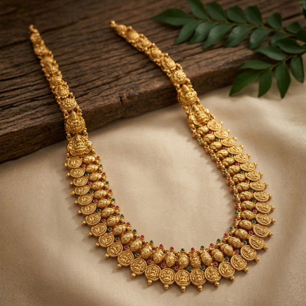 This Nakshi temple-style long set features intricate divine motifs with traditional detailing, offering a rich and heritage-inspired look. A perfect statement piece for classic styling.